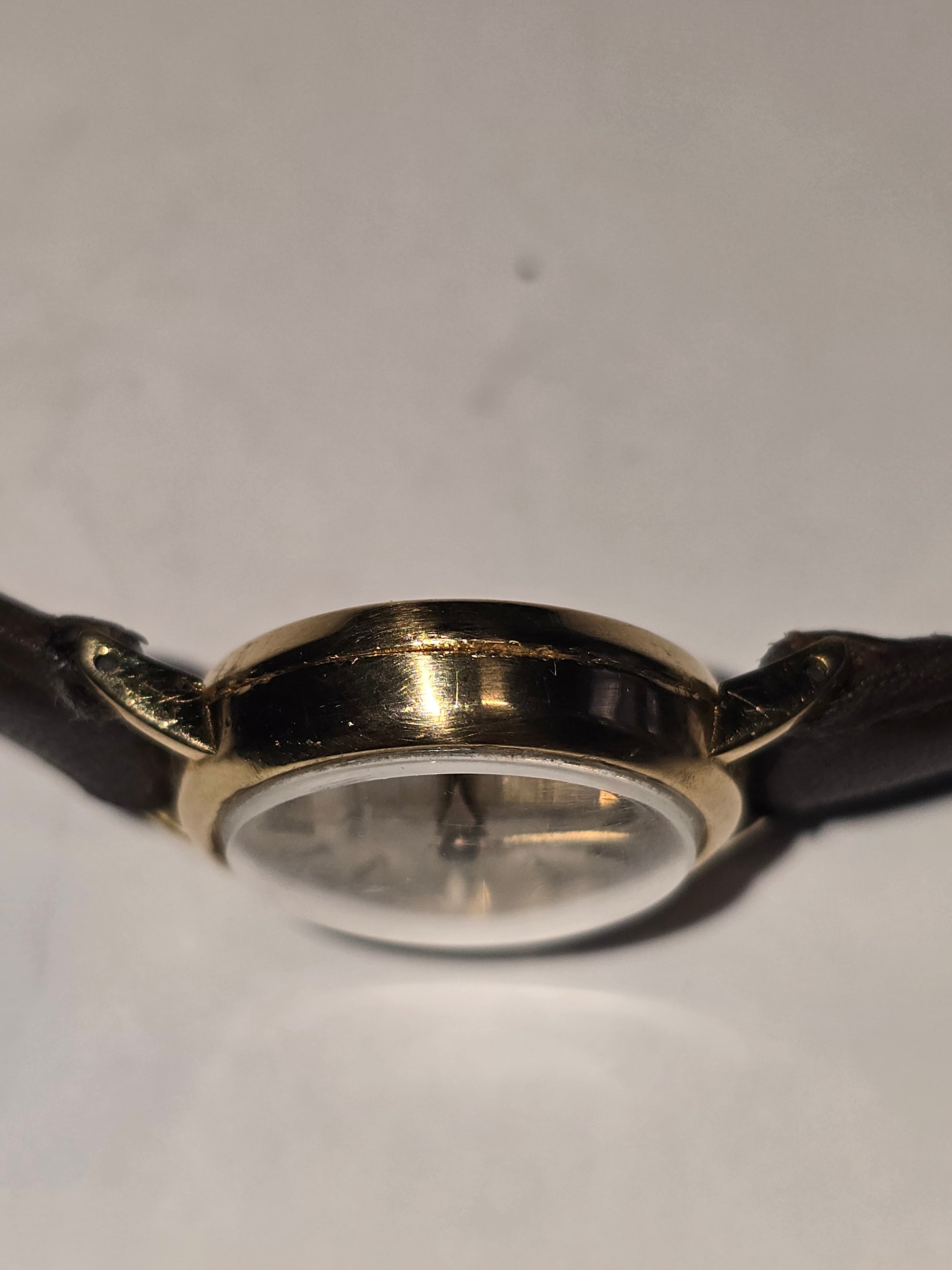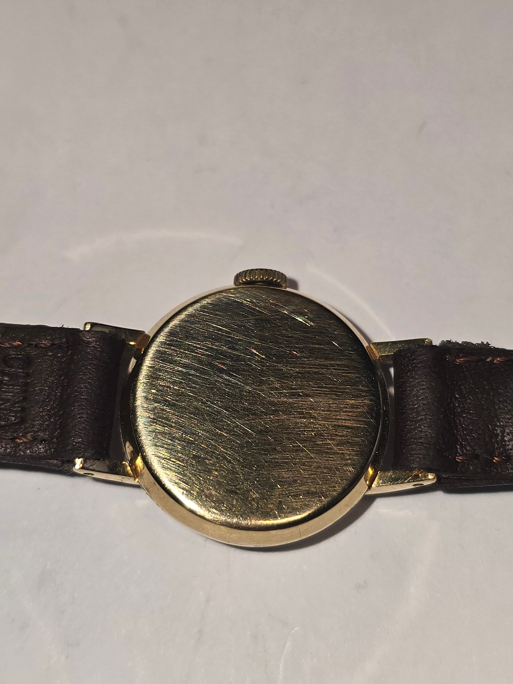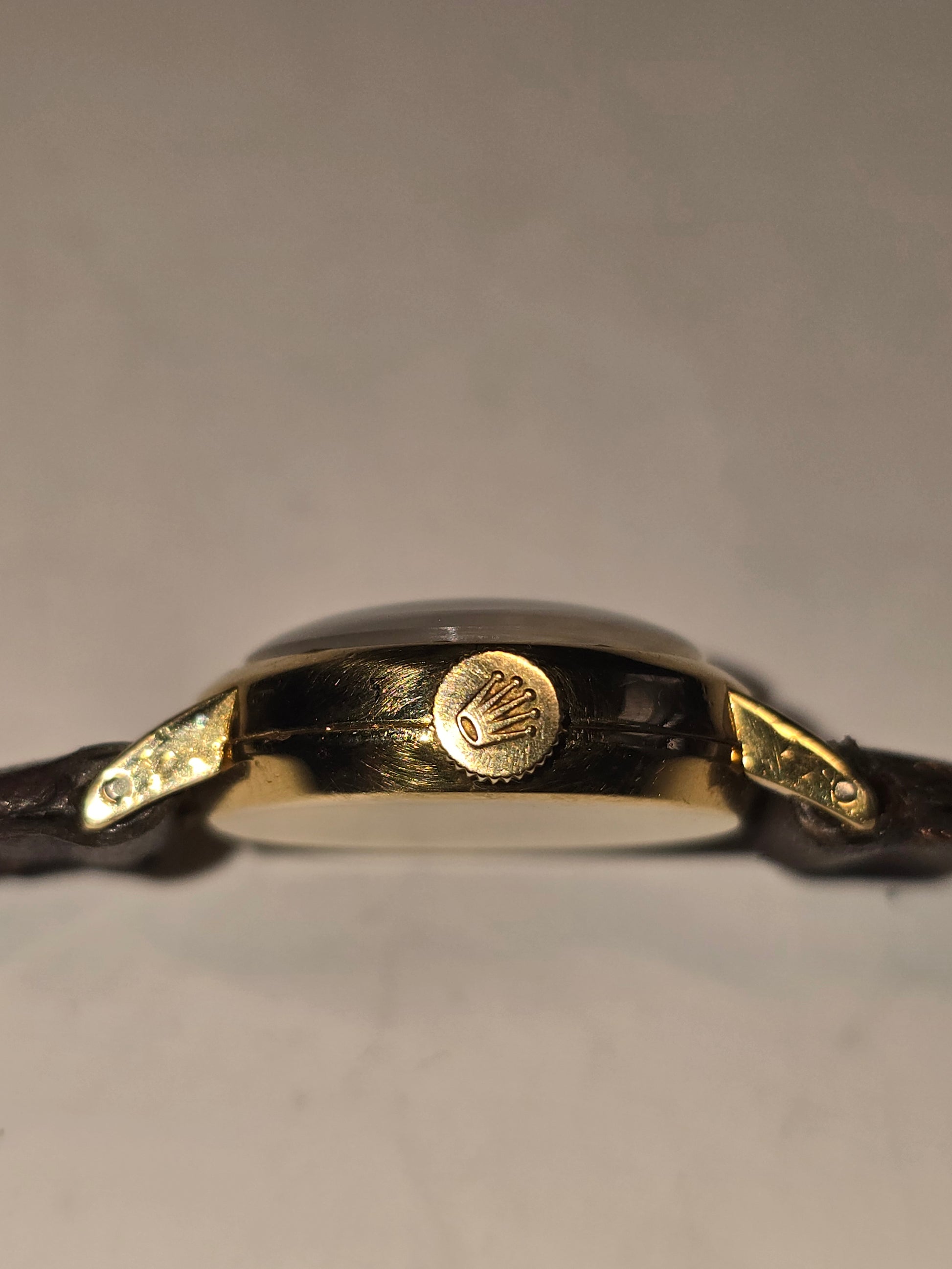 dress watch in 18k gold with champagne dial dark brown leather strap.