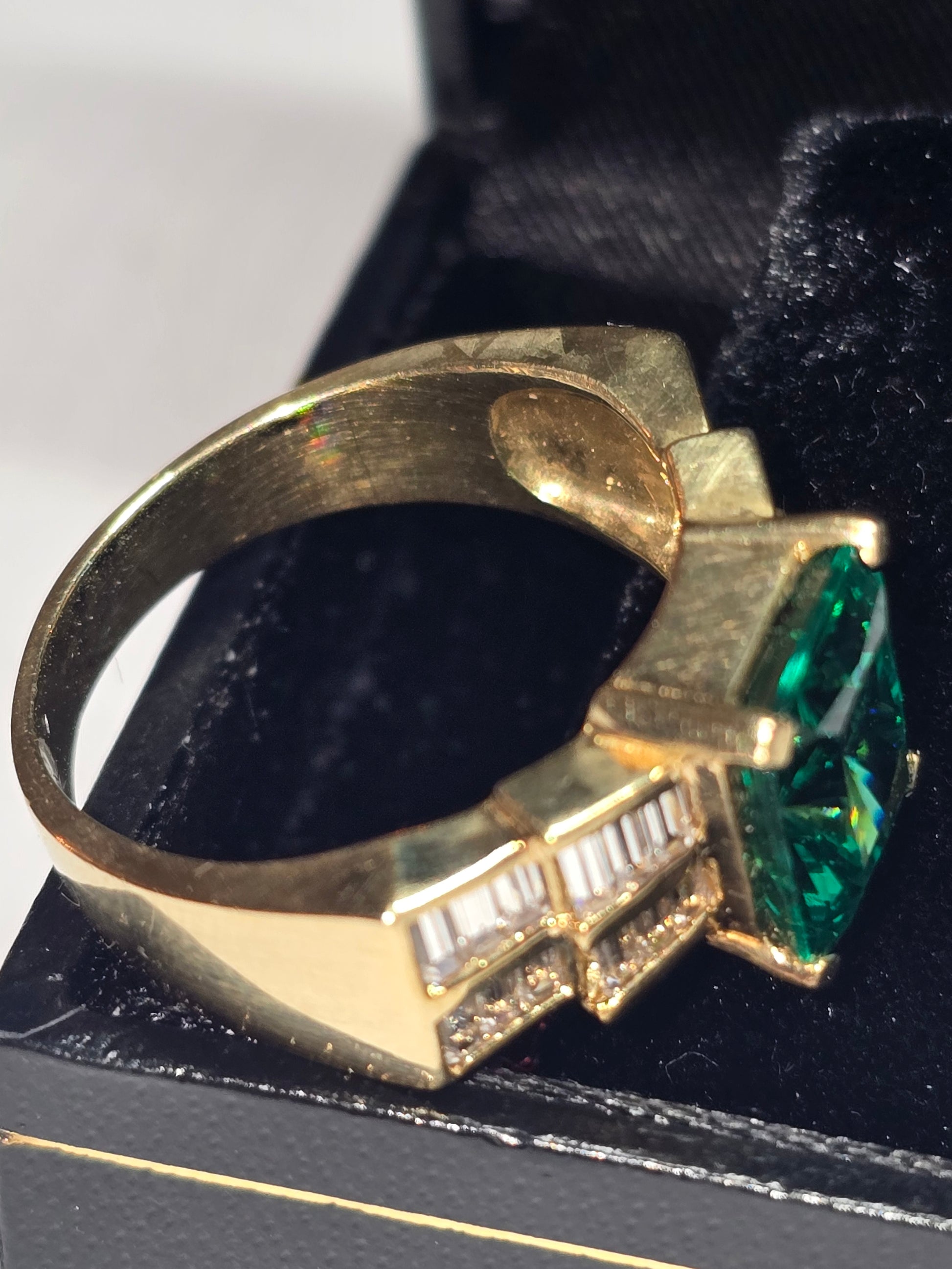 New 10k Emerald cut green stone and diamonds simulated engagement ring.