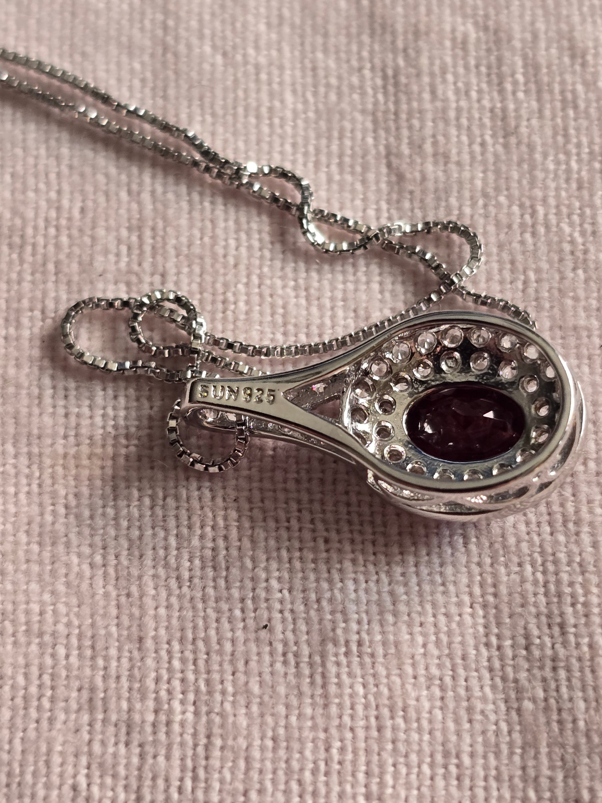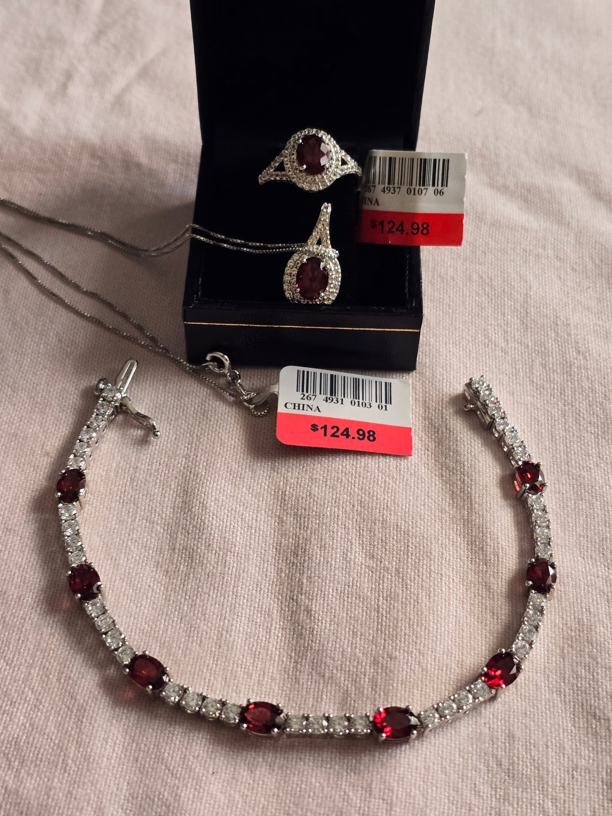 Sterling Silver Genuine Natural Red Garnet Lab Created White Sapphire and CZ Ring, Tennis Bracelet and Necklace in new condition with tags.