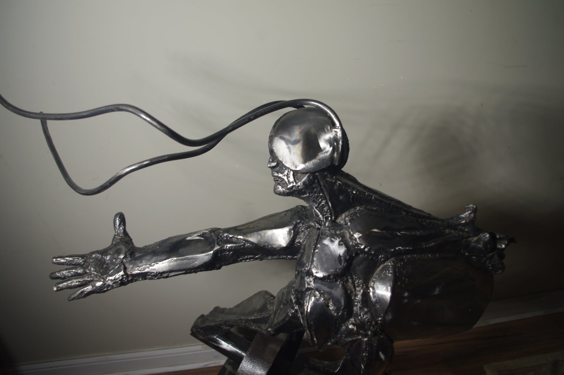 beautiful unique and big steel sculpture welded to a steel base signed.