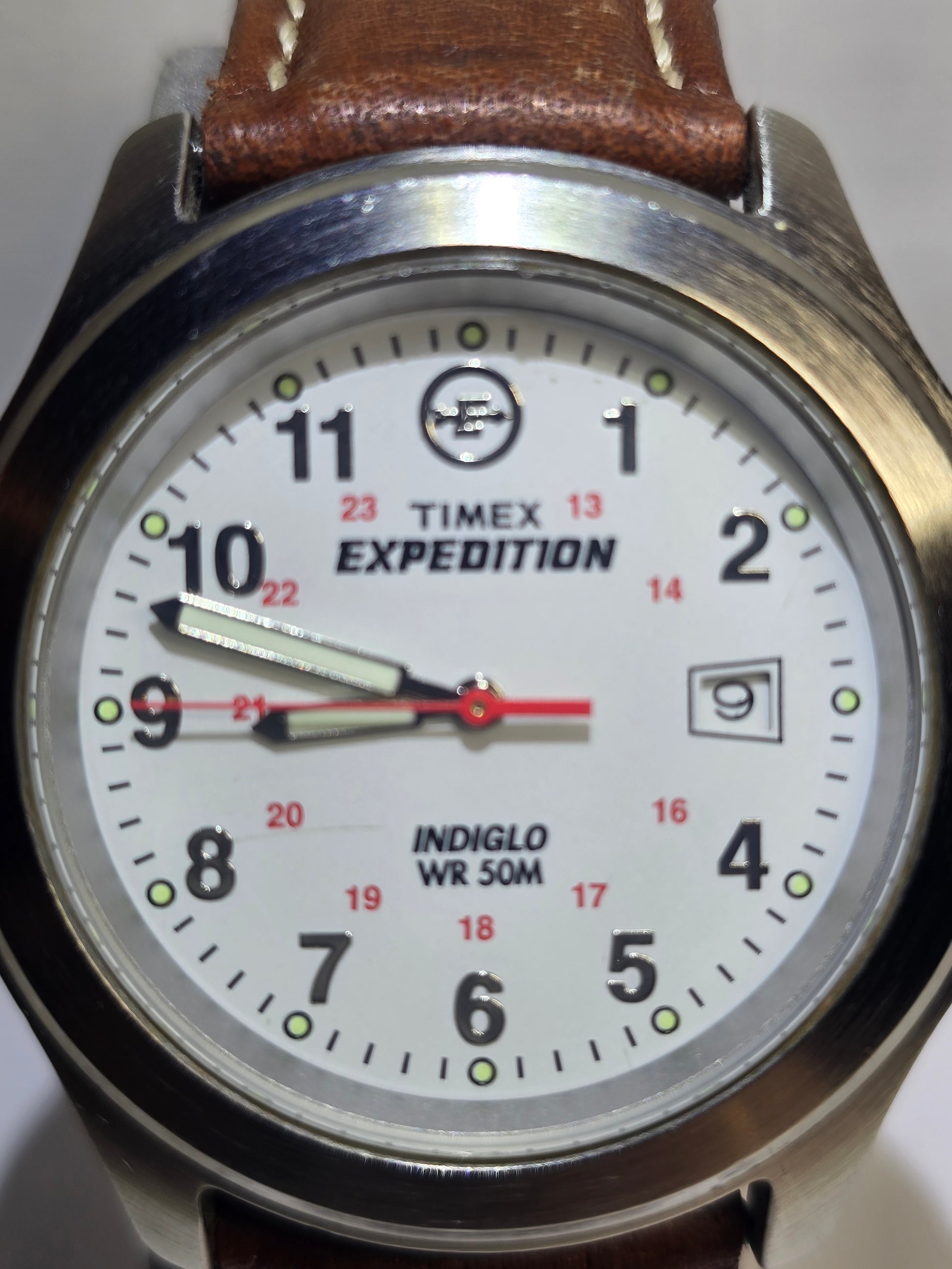 Timex expedition indiglo watch with a silver-tone case, white dial, and a brown leather strap.