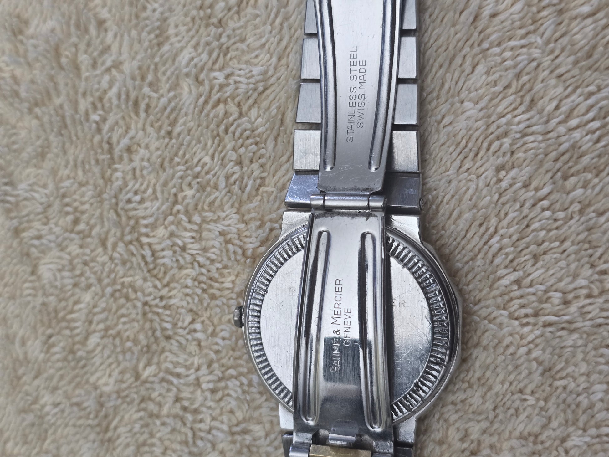 Vintage Beaume and Mercier Riviera 18K Gentleman wristwatch reference 6113.038.3, Switzerland around 1990, Quartz, Stainless Steel and Gold Combined. screwed down case back, bracelet with deployant clasp in 18k gold and stainless steel, champagne colored dial with applied hour-indices, gilded hands, movement tested in great running condition.