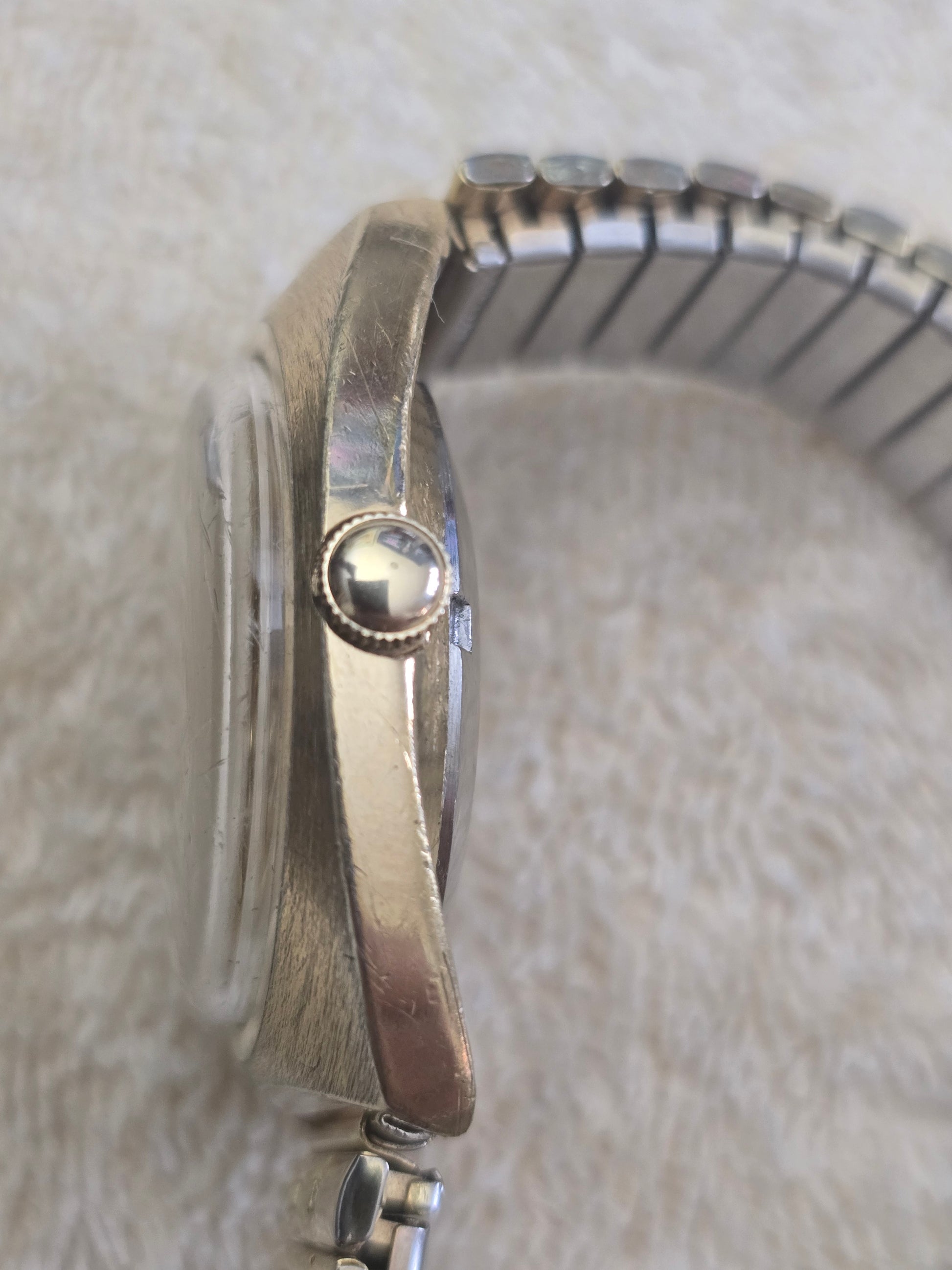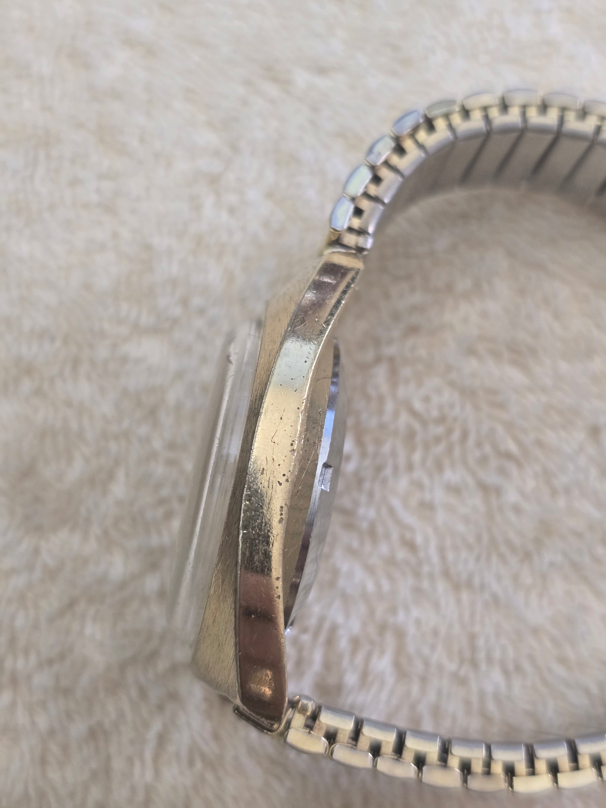 beautiful time piece preowned with some wear and tear great looking for its age with champagne dial with red numbers what makes it rare and gold tone case and expended band in great condiion. please look at the pictures for condition.