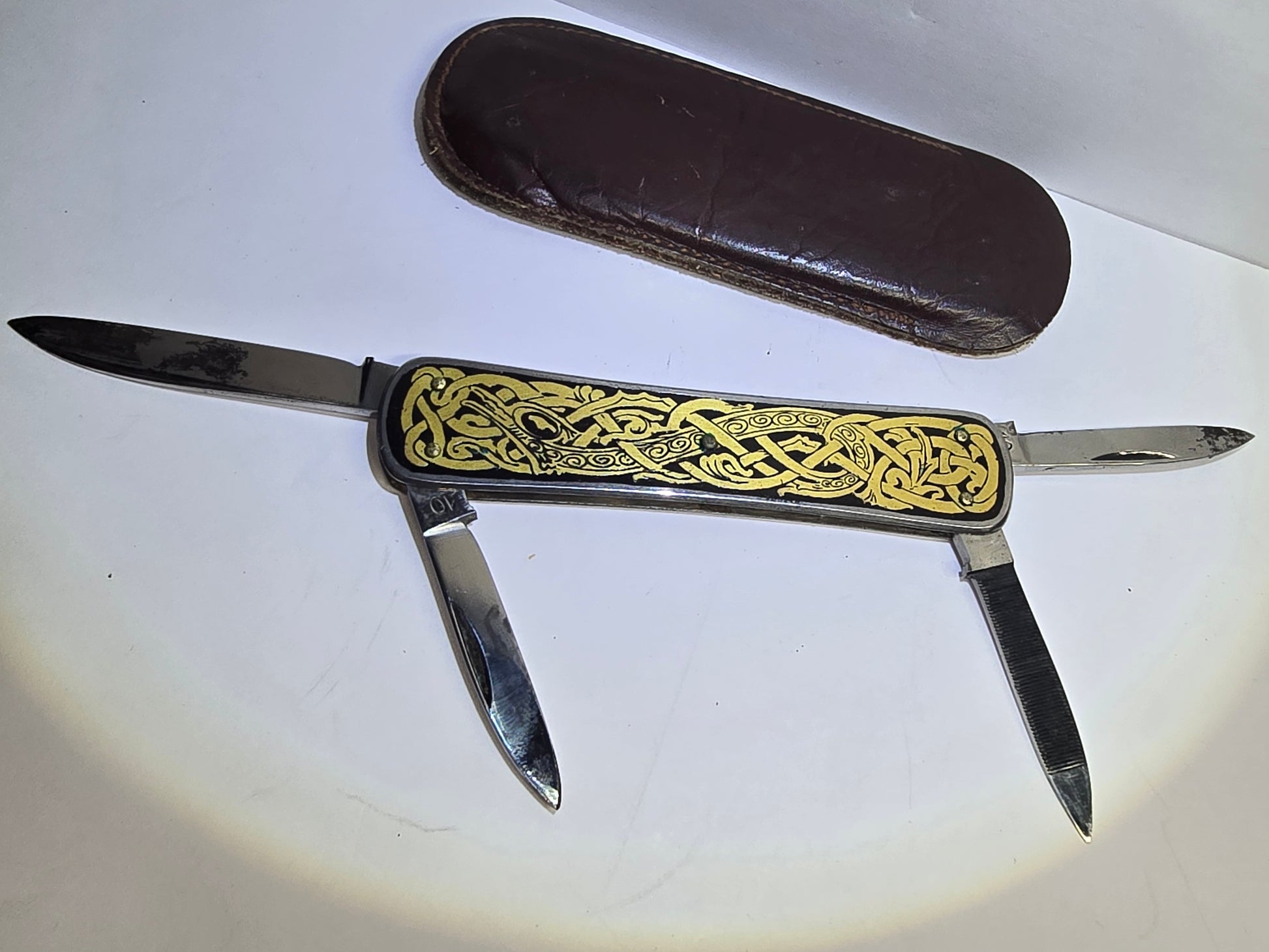 This is a rare folding knife made by Emil Olsson. It has four folding attachments: a larger the larger blade has the signature, "Emil Olsson Ekilstuna Sweden" and a star, engraved on it. The two smaller blade has a number 10 engraved on it, which I believe is a style number. I read some that Emil Olsson was in business manufacturing knives from 1898 to 1967, so obviously, this knife is pre-1967. I think, though, that it is possibly pre-1930's, based on my searching random knife forums and other similar listings on eBay. Although, again, I am not a collector and do not know anything about what makes up "quality" or "condition" for knives, but I can honestly say that this knife appears to be high-quality and in excellent condition for its age (from a lay person's perspective). I have seen others listed on and this one far surpasses them in condition, although it is obvious that it is not a "new" knife. The blades are sharp but do look like they will need to be re-sharpened. The knife is possibly stainless steel, and the body has black (enamel?) and gold (gilding?)