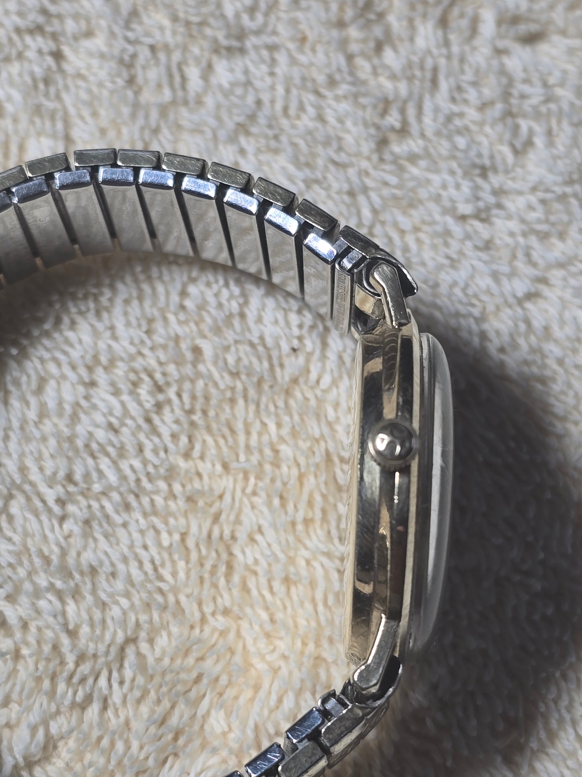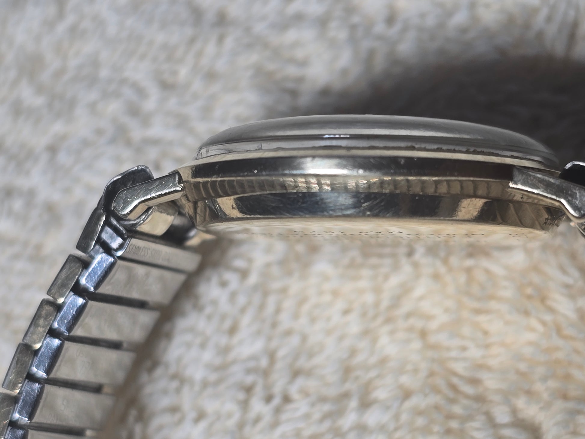 10 kgp case and aftermarket 10kgp expendable band excellent running and cosmetic condition please see pictures for condition, with a nice clean starburst gold tone dial made for Roper co. with engraving the back this watch don't open in the in the back case opens in the front this is a beautiful time piece in excellent condition for its age.