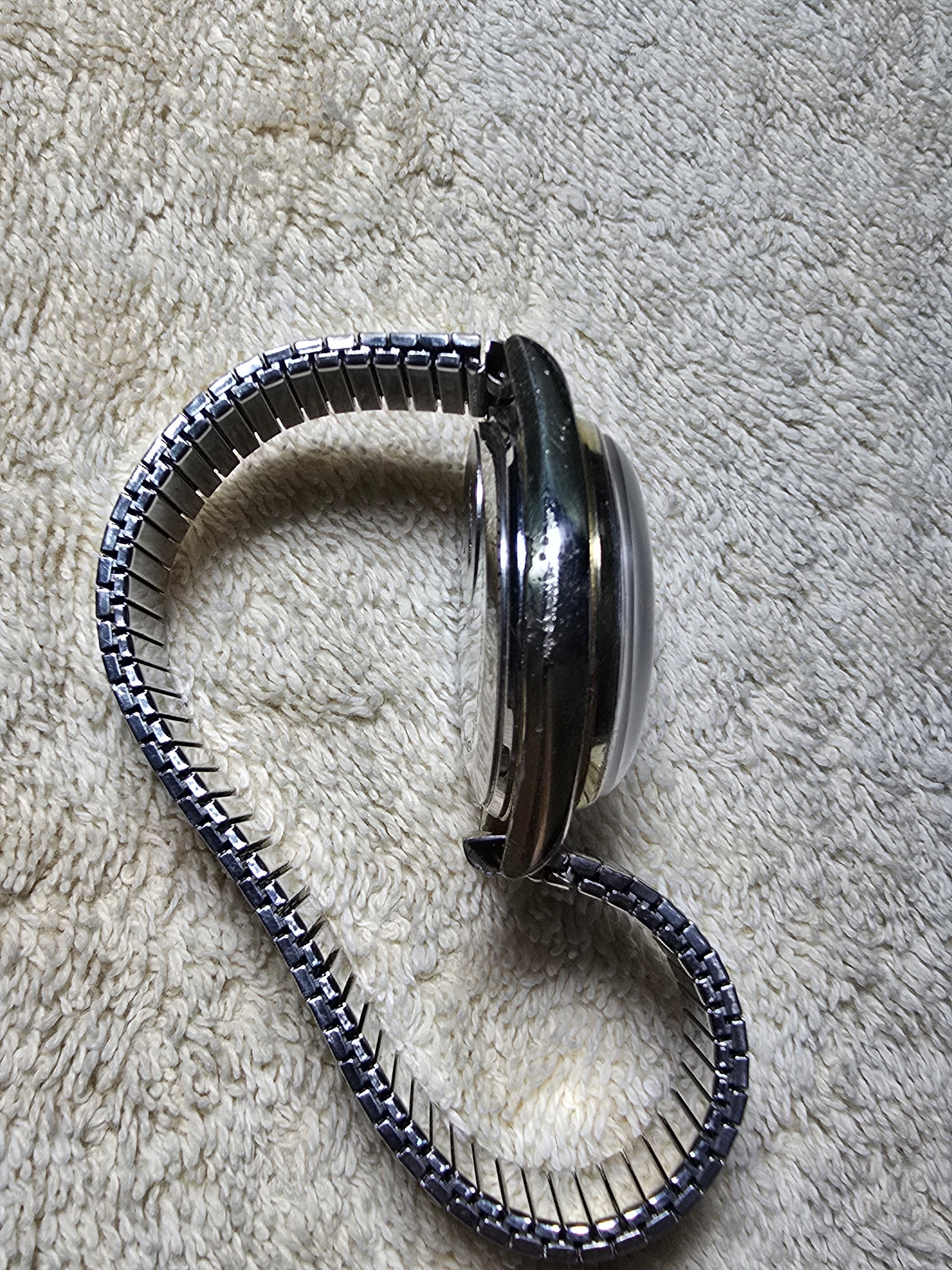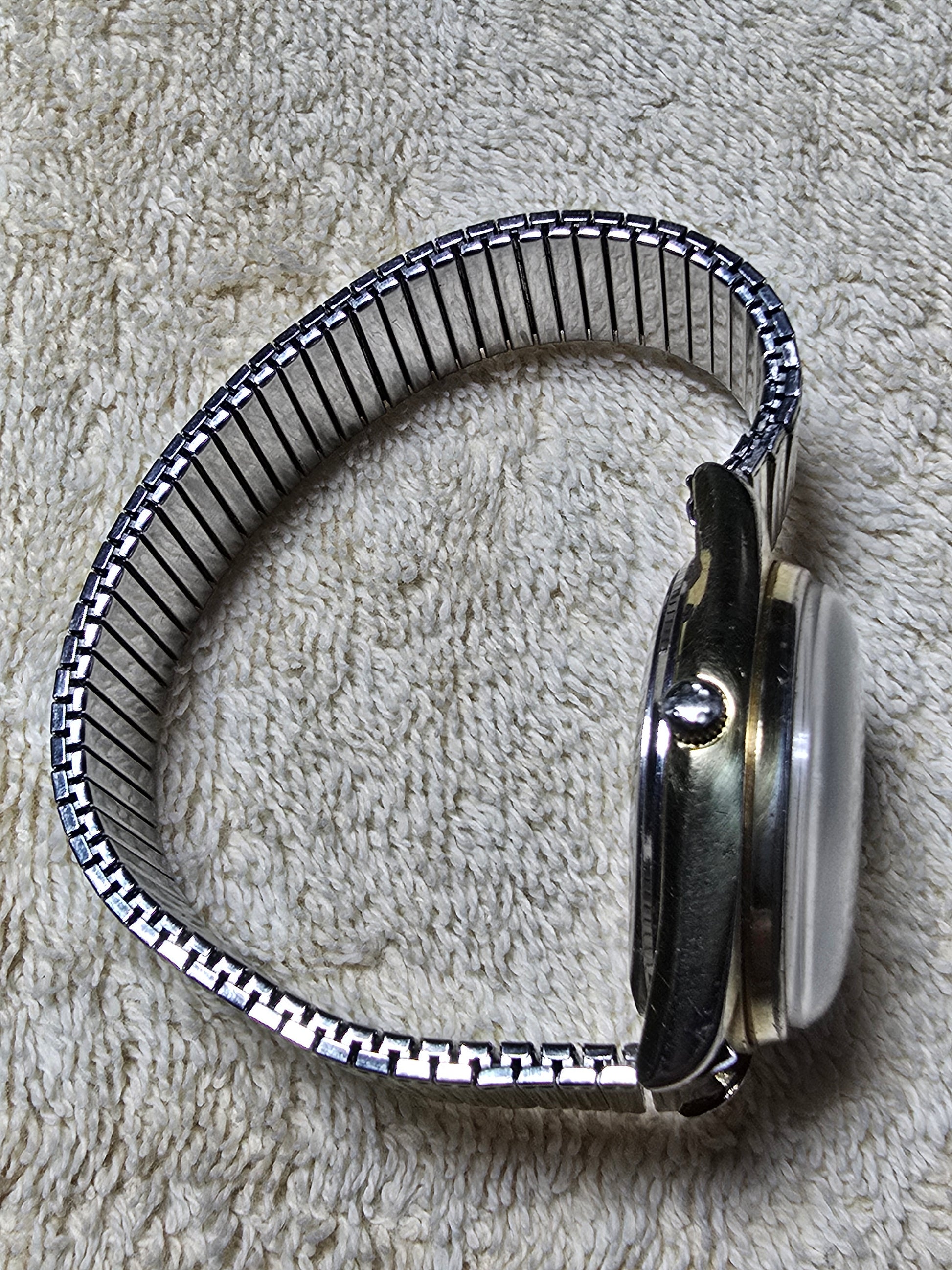 Day date gold tone white dial with expandable band.