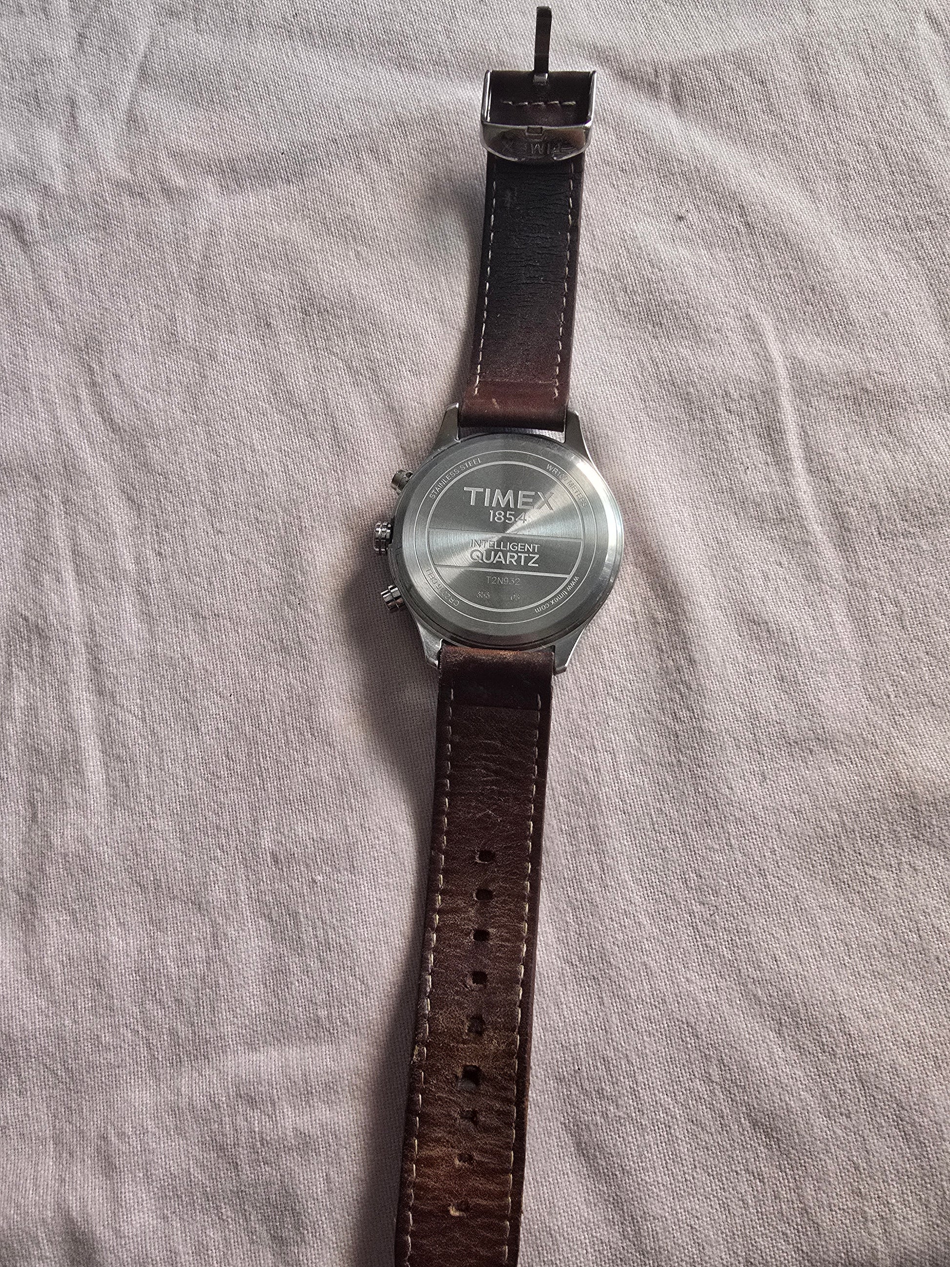 Timex intelligent quartz fly-back chronograph brow-cream leather strap watch.